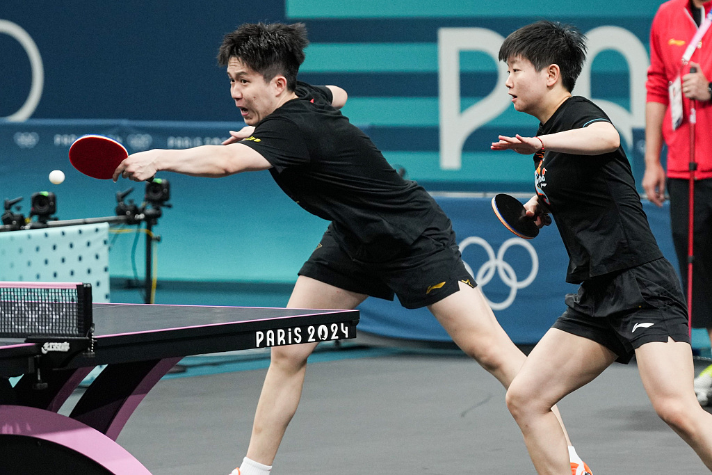 当地时间7月23日,法国巴黎,中国乒乓球队混双组合孙颖莎/王楚钦在南巴黎竞技场4号馆进行训练备战。